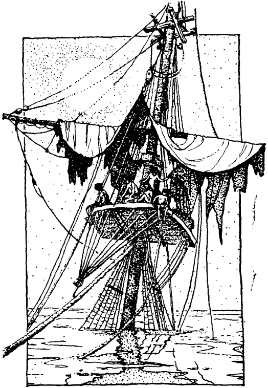 托劳萨号下沉的时候,船身差不多保持垂直;船体和主桅杆却仍然连结在一起;船体着底后,主桅杆仍高高地伸出水面。有八个人以令人不可置信的技术或者说运气吧——也许是二者的结合——搏击惊涛骇浪,爬上了桅杆,躲在索具上面。他们待在那儿,以用仅仅是一块风帆的碎片收聚的雨水,和偶尔捞到的零碎漂浮物解渴充饥。