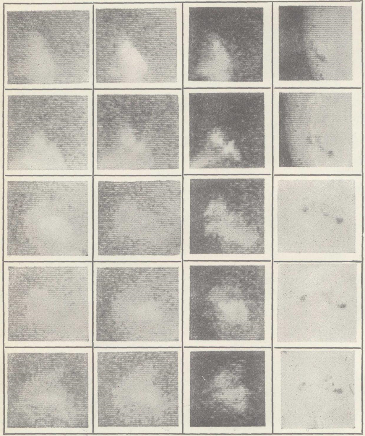 1980年11月6日至12日间太阳耀斑的演化。X射线从已电离的氧、氖和镁(从左到右)中发射并与耀斑区(最右)的光学图像作比较。