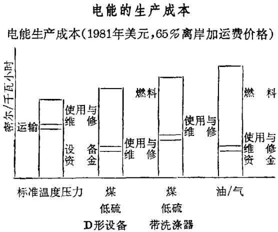 假定情况就是这样,那么为什么就不简单地继续选用油或天然气呢?这次见面确实没有必要评论油或天然气是否可以长期获得,但还有一个因素是我们不得不考虑的,那就是它们是石油化学原料。如果开发核动力资源,不仅会节约油和天然气,以便用作石油化学品的原料,而且会节约钱。我能找到将来生产电力的设想成本,它们表明核动力是有竞争力的,而且在大多数情况下比煤或油便宜(见下图)。例如Boston Edison公司报告说,他们的核动力成本比用油产生相同的功率要便宜35%。这个估计还是在石油输出国组织最近决定提高油价之前做的。