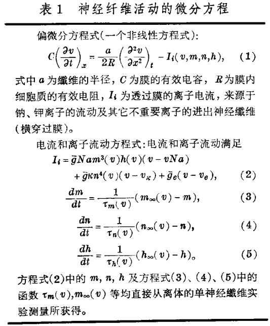 简要地说,沿着单神经纤维膜传导的电位符合一非线性偏微分方程(见表1)。除了问题的多种解答需要讨论以外,这方程式在描述神经纤维行为的许多方面都是非常成功的。为了扩充和推广这种模型已经做了许多工作。
