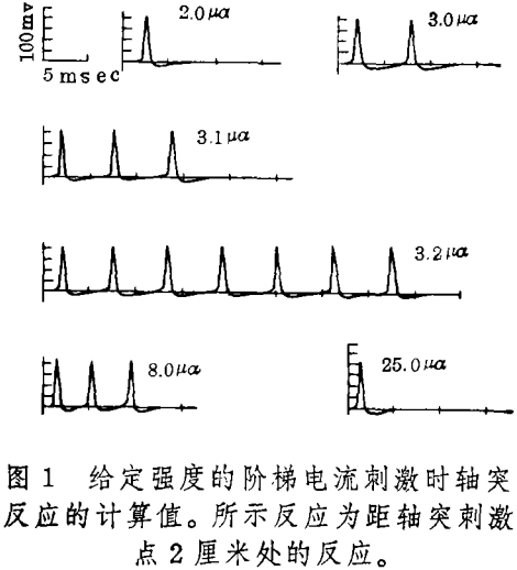 2. Hodgkin-Huxley系统的特点是:对仅仅阈上的电流刺激强度而言,就出现一串有限的脉冲,当刺激强度增加时,脉冲数目随之增加到极大,随后刺激强度进一步增大时脉冲数目便降低,如图1所示。这基本上是和实验结果相符的,仅有几点重要细节不同:
