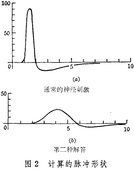 多种解答 数学家和生理学家都感兴趣的是能够得到几个解和有几个解能满足表1的方程。因为良好的初始神经冲动具有固定的波形,并沿神经膜恒速传布。偏微分方程的近似解必定接近于维持传导波形式v(x,t)=v(x,θt)。这样,偏微分方程就转换成了常微分方程。(这样处理和先前描述的脉冲形式相差较远),常微分方程的初始解由θ值的选择而定,从神经的远端开始积分到另一端,不同连续行波导至一个非常满意的神经脉冲,脉冲的波形、大小、速度均可与实验结果相比。且未被实验观察到的另一结果也发现了。(见图2,曲线a的上一行是通常的神经脉冲。)
