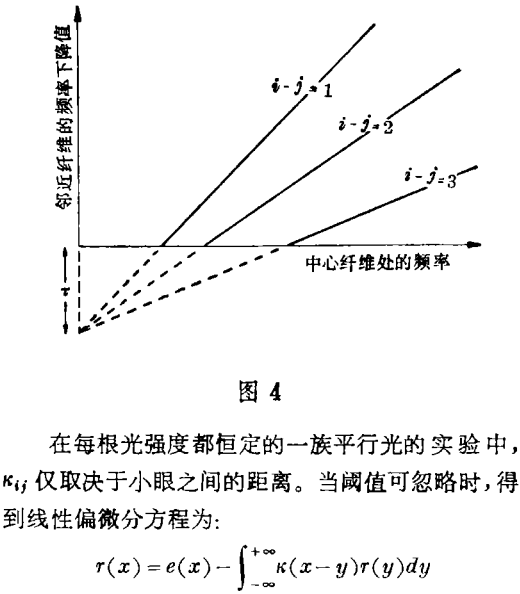 当仅一根旁的小眼不掩蔽时,旁侧抑制问题就可被研究,当二根小眼之间的距离i-j增加时,相互作用κij的强度就降低,阈值τij增加(图4)。这仍然是一种推测。事实上,阈值仅简单地与κij有关:τij=τ/κij,这里τ如图4一样定义。