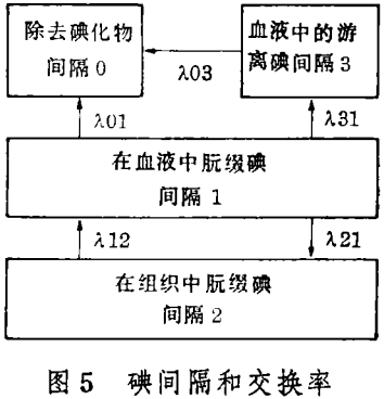 一则实例 在研究碘(实质上是碘离子)如何在狗身体内运动时,重要的问题是考虑包含主要产生甲状腺的甲状腺素那部分系统,在其中碘与蛋白结合着。一个典型的实验着手于给狗以足够大剂量的碘化钝,使甲状腺及身体其它组织都被非结合碘所饱和,事实上,这使甲状腺不活动,于是被作了标记的甲状腺素就引进到血液中,一部分甲状腺素在体内循环并扩散到身体细胞内,在细胞内即发生新陈代谢过程,然后作为甲状腺素再回到血液内。另一部分甲状腺素在血液内成为非结合碘,而一部分甲状腺素以结合的形式从肠和内脏排泄掉,游离的碘化物经过肾从尿排泄掉。