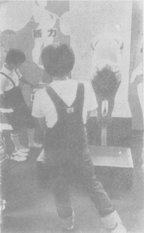 ⑤ 在简易体力测定分馆里作向前下屈的体前位体力测定,插入卡纸可以自动记录测定结果。