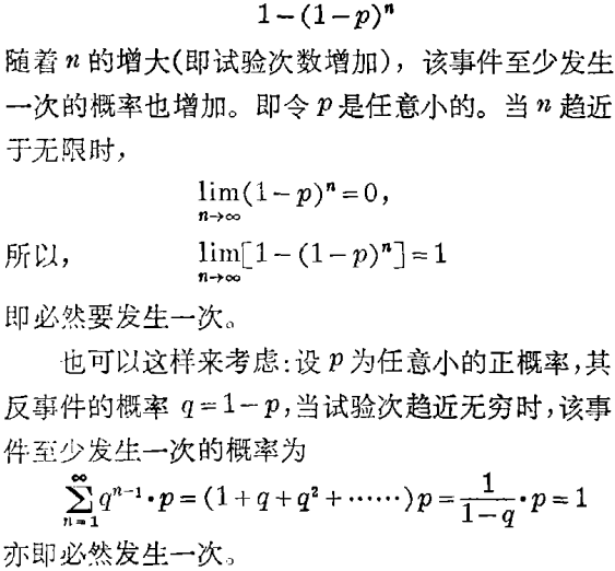 像原始海洋中生命分子的出现(生命起源)和生物的基因突变等,当然都具有偶然性。设这类偶然性事件中某一事件以很小的概率p发生(P很小,这就反映了这一事件出现的偶然性)。根据概率论,在n试验当中,该事件至少发生一次的概率为