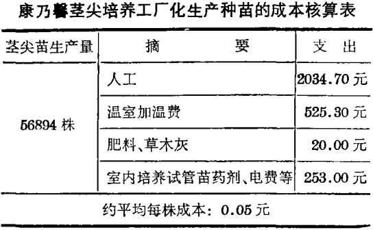 当然,进行试管繁殖工厂化生产种苗,必须解决以下二方面问题:第一、能否掌握某一植物的快速大量培养试管苗的技术,是否已成功地实践出一套工艺流程;第二、同其他常规技术相比,其经济上是否合算,这后一点是当前阻碍工厂化生产的“拦路虎”。以我们康乃馨茎尖培养工厂化生产的成本核算来看,在试管生产中,包括工作人员的工资(每人每年按1000元计算)、所用电费、药品、器材等,据初步核算生产每株种苗人民币约为0.05元(如下表)。据市场平均售价每株苗0.15 ~ 0.20元,由此可以看到其经济效益。进一步生产切花,投入国际市场,则经济效益更大。
