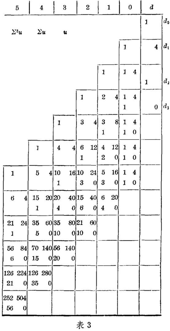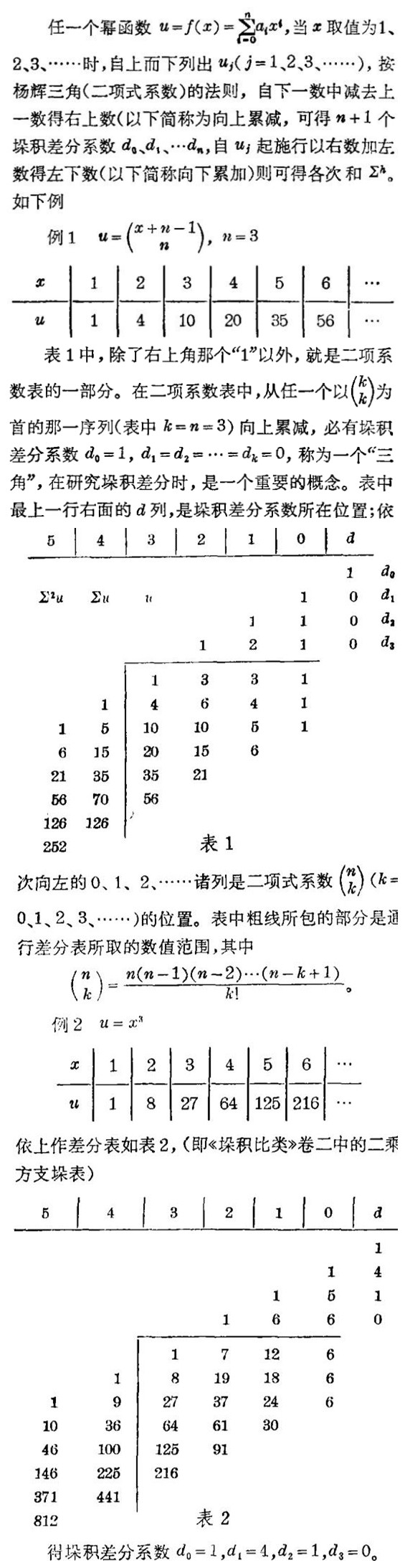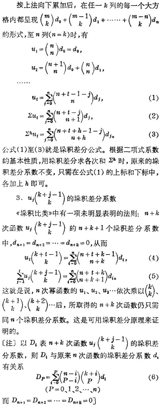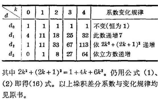 以上就是取得垛积差分系数的方法,其他幂函数可以类推。由此我们可以看出,现在通行的牛顿、高斯、贝塞尔、司脱林等以西方人命名的差分公式,他们所取的差分系数的位置所在,都与函数序列相交且在它的右侧,而垛积差分系数,则是与函数序列平行的,故是不同的。