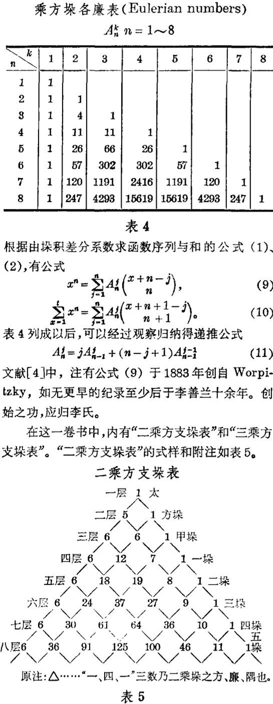 1939年,章用在[3] 中创立了递推公式,推广到任意的n变,并列出李氏三角形。罗见今同志说,这是“第二种李氏数(欧拉数)的推广”,为“外论所未见”,“迄未所闻”的。[6] 法国数学史家J. C玛尔茨洛夫1982年8月在“国际中国科学史讨论会”上发表的论文《李善兰的有限和公式》中说:“第四章(即第四卷‘三角变垛’)的公式,只要进行代数计算就够了”,所举的仅是时的别解。可见迄今为止国内外对此了解是不够的。现在看来这是一个丰富多彩的特殊多项式,与组合分析、有限差分有许多联系,不但与第一类司脱林数,欧拉数有联系(这是中外论述已提过的),还与第二类司脱林数,与幂函数的各种表达式有联系,详细的论证与推广有拙稿《广揉积比类》,其推广、组成与应用在[8] 、[9] 中有简略介绍。