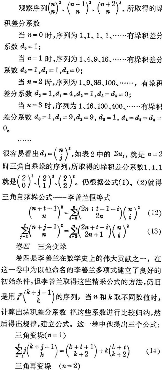 在这一卷中,李善兰作出了著名的李善兰恒等式,曾引起了中外数学家的广泛注意,并提出多种证明。[5] 中对之有详细的介绍。如果利用本文的公式(6),及二项式系数的垛积差分系数d0=1,d1以上为零的性质,可立即得证更较简捷。李善兰的推导过程约略如下: