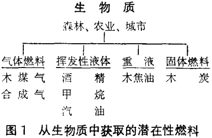 生物质能基本上是以来自不同渠道的植物为主要原料的。其所含能量非常均匀约为9000英热(英国热量单位/磅),大约是煤的二分之一。生物质经过氧化可直接转换成能量,或者可为生产各种固体、液体、气体燃料提供一种原料(图1)。