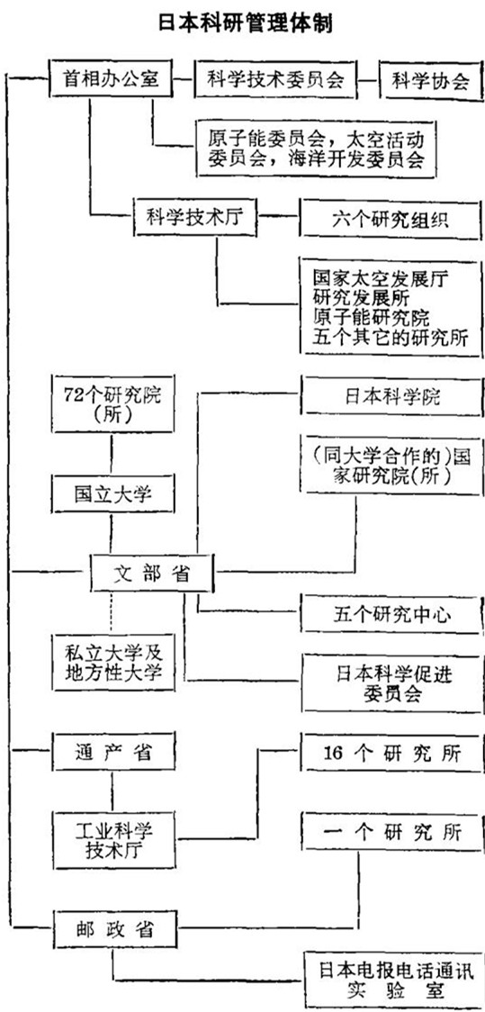 日本的科学技术最高决策机关是科学技术委员会(Council for Science and Technology),由十人组成的顾问委员会领导,首相出任主席一职。十个委员中还包括大藏相、文部相以及科委主任(Science Council of Japan)。科技委员会除了制定一般政策外,还通过特别合作基金对科研项目予以直接的资助和领导。