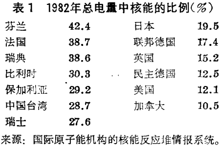 核能在整个电力供给中所占的分量各个国家并不相同。表1列出了1982年总发电量中核能占了10%以上的十三个国家和地区的情况。其中有七个国家和地区核能发电量已超过总量的25%。