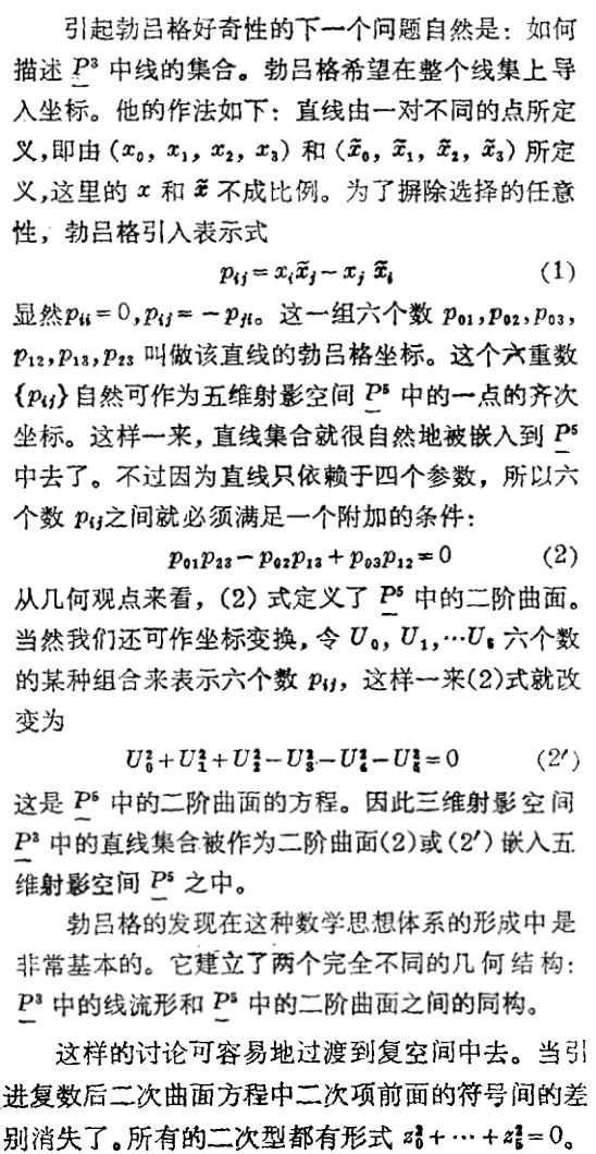 回到彭罗斯的几何思想上来,不能不感到惊讶的是:为什么在研究一个纯粹实的对象(时空)时,会出现复的对象?然而这在19世纪后半期的几何学家看来是根本不足为奇的。彭罗斯理论的构造与一些有百余年历史的数学思想有联系,不过最近数十年来人们忽视了这些思想,现在它们不那么流行了。这里指的是勃吕格(J. Plücker,1801 ~ 1868)的想法。勃吕格构造了这样的空间,它的元素(点!)是通常的三维空间的线。他花了多年的时间来发展这一概念。勃吕格死后,他的最后的一些结果由克莱因(Klein)和克莱布舍(Clebsch)编辑在于1868 ~ 1869年出版的学术论文集《将线作为元素的空间的新几何学》一书中。这一线空间维数是4,这也许是科学中最先出现的四维空间。奇怪的是,当四维流形出现在相对论中,并变得时髦的时候,却没有人把闵可夫靳基的四维对象与早在50年前就有的勃吕格的四维对象加以比较。50年后彭罗斯却正是这样做了,并且现在看来已经取得了很大的成功。我们将试图描述从勃吕格到闵可夫斯基,几何发展的历程。但是为此我们还必须先回顾一下一些更早的情况。
