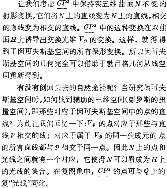 在某种意义上说,彭罗斯的这种考虑并不是全新的。在E. 嘉当(Elie Carten)的对称空间理论中就隐藏着(但并不很深)闵可夫斯基空间的复实现。但是现在这样提出的意义倒并不在于几何发现本身,而是在于能使它成为数学物理中一些重要的线性或非线性方程解的积分表示的解析构造的源泉。用扭量理论求得的一些重要的新结果(杨 - 密尔斯方程的瞬子解,爱因斯坦方程的复自对偶解)渐渐清除了人们对彭罗斯方法最初抱有的抵触。当然应该指出,为了得到这些结果,我们需要一些高深的数学手段,例如射影空间上的丛,科西 - 黎曼上同调等。幸运的是,这些手段在代数几何和多元复变函数理论中早就以适当的形式表述出来了。