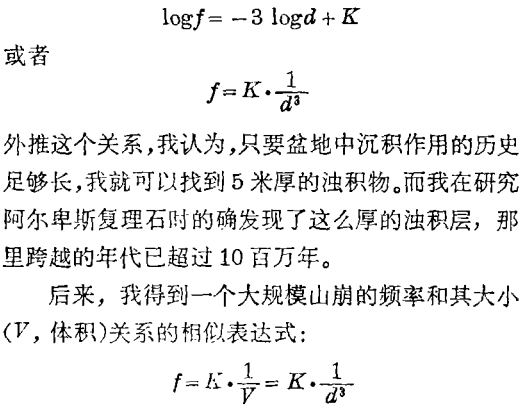 当我开始研究加州芬吐纳盆地上新统地层时,我发现薄的浊积物确实是最常见的。10厘米或更薄的沉积层大约以每千年5次的频率出现。一米厚的沉积层也不罕见,而在三百万年的记录中,我发现最厚的沉积是在3到4米之间。用考查芬吐纳盆地的露头和贮存岩芯得到的出现频率(f)和沉积厚度(d)的数据,我得到一个粗略的关系式(图1):