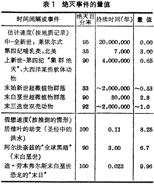 深海岩芯精确的地层学记录清晰地证明,白垩纪末期之后的绝灭速度不可能是莱依尔式的。就像上面提到的,大约3万年中有90%绝灭就是一个量值接近于3的绝灭事件,或者说与北美晚第四纪哺乳类绝灭事件的强度大致相等,在那里,35%绝灭发生在7千年内。对照起来,居维叶世界末日或阿尔法奈兹(1980)黑暗笼罩的情形都是假定量值为7或8的灾难,均大大超过地质上已有记录的绝灭速度(表1)。