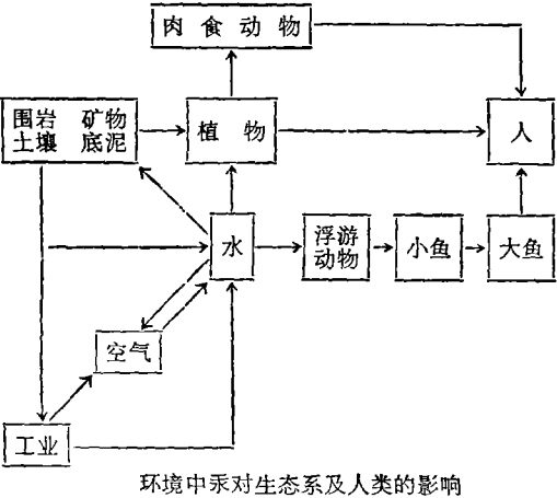 地球上岩石圈内汞的平均含量约为0.07 ppm,而作为非汞矿床周围的基岩含汞量更低。大气圈内汞的本底值约为1 ~ 10毫微克/米3,矿床上方空气中的含汞量比本底要高5 ~ 6倍。土壤中汞的量远比大气中高,一般为80毫微克/米3,也有高达11×102毫微克/米3。铃木继美曾在人类生态系与化学物质相关的讨论会上提出“鱼与汞的关系问题”,一针见血地指出工业废水对环境污染造成的问题,并阐明了人类与粮食及鱼之间的关系是日本水俣病的根源。水与气中的痕量汞在区域环境中对生态系的影响,体现了汞的地球化学特征及其在大气与水体及土壤间的循环。如图所示。