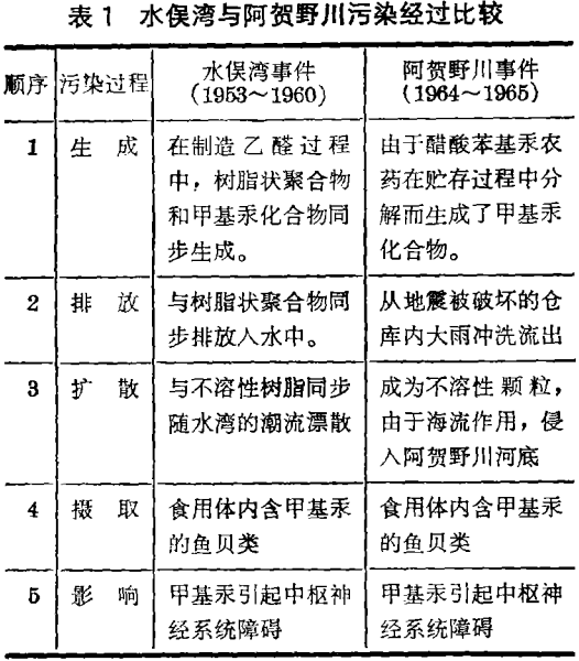 上述对比表明,阿贺野川污染经历一年左右,即被控制属于局部污染;而水俣湾污染历时八年之久,才初步得到控制。这是由于前者为一时性局地污染,而后者为工厂排污造成,具有连续性的污染。