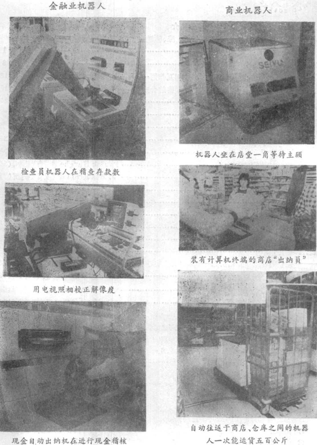 然而机械电子学机器人化的波涛远远不只局限于工厂。例如正在使高级金融业界面目一新的金融业机器人正在陆续开始登场,活跃于高精尖技术领域的机器人,在某些方面将比“圆颅方趾”的人类有过之而无不及……各行各业的机器人正在各自领域广显神通,为最终消除它与人的界限而阔步前进。于是历史相沿的一些路障壁垒势将受到无情的冲击,从而引起了一场空前的巨大改革。