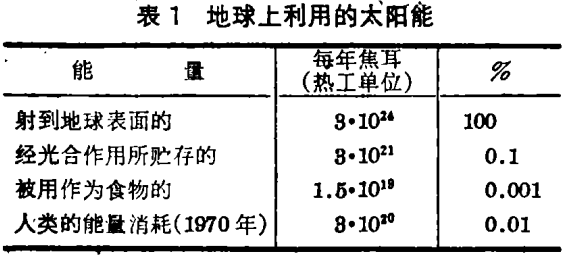 这就产生了一个问题,即如何实际利用地表辐射的太阳能。据估计,用于陆地植物和海洋浮游生物进行光合作用的射到地球表面的太阳辐射能平均不超过0.1%。但即使是这样一个数量也超过人类对各种能量消耗的10倍(表1所示)。