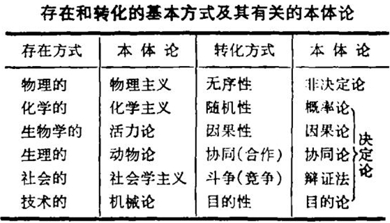 我们既可以对科学研究对象的存在方式进行分类,也可以对它们的转化方式进行分类;不管我们可以从什么方式开始着手研究,但我们总是要被引导到它的相互补充的另一方面。这样,我们就可以把存在分为物理事物,化学系统,生物系统,精神系统,社会和人工产品等几类,或者也可以把转化的方式分成无序的、随机的、因果的、协调的、斗争的和目的的等几种类型。在不考虑其他方式的情况下,如果把兴趣只集中到单独的一种存在方式或转化方式,就会导致一个特定的本体论——一种肯定只有某一方面的世界观。只有把各种可能的存在和转化的方式综合在一起,才会产生一种实在的本体论,即一种与我们关于实在的科学知识相协调的本体论。见下表和图: