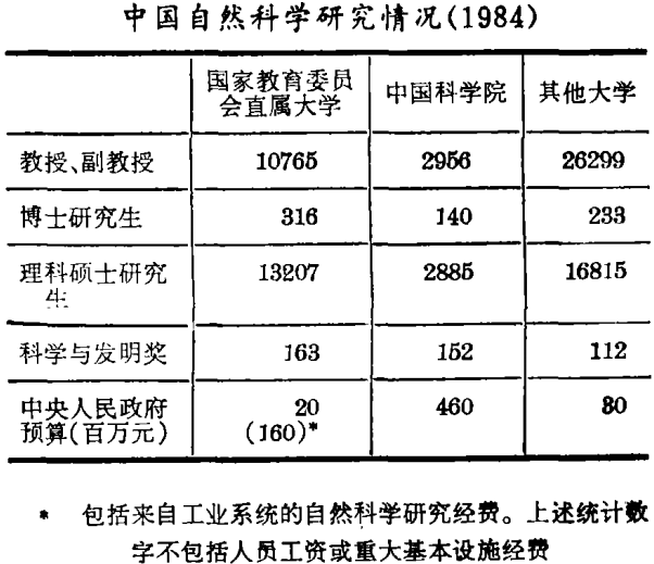 自从人民共和国成立以来,一直是中国科学院而不是大学控制着全国的基础科学研究工作。无论在科学研究的条件、时间或是经费等方面,高等院校只不过是科学院的穷亲戚罢了。但是,自从新的改革以及教育部改组为更有权威的国家教育委员会以来,有迹象表明,将赋予高等院校以更多的平等机会。