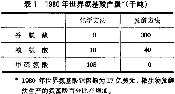 人类和动物从他们吃的食物中获得蛋白质,然后这些蛋白质被消化酶降解成为氨基酸。这些氨基酸又被合成为新的蛋白质。有些蛋白质,特别是植物蛋白质,缺乏人类和动物生长所必需的氨基酸,其中有赖氨酸和色氨酸。添加这些氨基酸可以改善缺蛋白质的营养价值。这些氨基酸可以用化学合成或利用合适微生物采用生物学方法制造。生物学方法的一个优点是它产生自然的L - 型异构体而化学过程产生D - 型和L - 型氨基酸的外消旋混合物,仅氨基酸的L - 型异构体可用于蛋白质的合成。另外,有些氨基酸在工业上可作为合成几种其它有机化合物的中间体。表1列出了几种用生物方法以工业规模生产的氨基酸。早期的方法是寻找自然的能合成所需氨基酸并能将其分泌到环境中的微生物,谷氨酸棒杆菌就是其中之一,它在日本用来生产谷氨酸单钠——一种增加食物风味的添加剂(味精)。