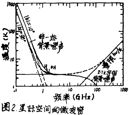 国家航空与航天局正准备开始下一代射电研究。这将是一项在地球微波窗(1 ~ 10千兆Hz)中较宽的频率范围内(而不是过去的魔频)进行的系统的研究。图2所示就是这一自由空间的微波窗。它是由地球大气层的水蒸汽为地面天文台在10千兆左右留出的窗口,在这一频率范围内相对来说没有天然射电噪声,因而最适合于星际通讯。位于微波窗低端的是水洞(1.4 ~ 1.7千兆Hz),对星际无线电通讯来说,这可能是最有吸引力的频率范围。