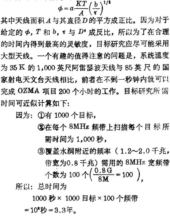 目标研究将集中于800 ~ 1000个专门的目标,其中包括格林威治皇家天文台目录中的773颗远达25秒差距(81.5光年)的F、G和K类太阳星和其他具有特殊光谱的星及星系。这项研究的峰值信号分辨力为1 Hz,并集中在水洞附近的频段内进行,射电天文台的灵敏度(Φ)通常按Wm-2计,它与要求的信噪比(α)、该系统的温度(T)、天线面积(A)、分辨力带宽(b)及积分时间(τ)有关,即:
