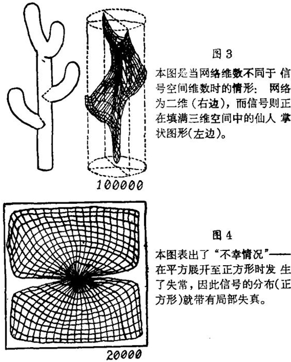 注意到,纲络的每个元件的邻接数决定(近似)其拓扑维数:二个邻接——一维网络(方向为向前——向后),四个邻接——二维(增加向左——向右方向),六个邻接——三维或二维(但为三角形,而不是正方形聚集,以可以区别出平面上的更多方向)。在神经细胞的实际网络中每个神经元可以有上百个邻接,这样该网络的内维数就可达很高——大大地超出我们直觉观念范围之外、因此在分析人脑功能中就会遭到很大困难——我们所能做的也只不过是琢磨琢磨这些网络的定性规律而已!元件(信号)参数的拓扑维数和空间维数可能是不相重合的——一维网络(线)可以盘绕起来直到填满了平面图形并映出其外形轮廓。因此,参数的空间维数可以更高。
