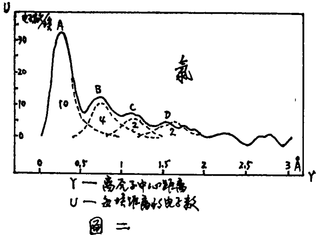 还有,在他的《X射线与电子》一书中,他说明了决定在原子中电子径向分布的傅里叶方法。他指出(参见图二)氯有四个电子密度峰值,分别包含10、4、2、2个电子。可以肯定这些峰是从不完全收敛的傅里叶级数取和产生的。