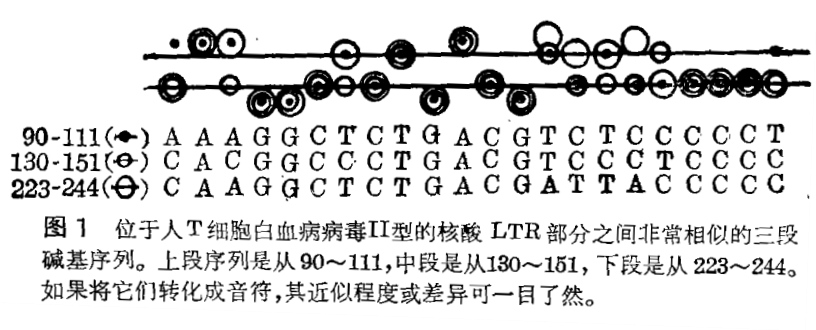 两人在信稿中介绍说,若将大肠杆菌中EcoRI基因(产生一种切断DNA的酶)特定区域的DNA序列谱成旋律,能产生听上去充满魅力的音乐作品。宗像君将人白血病病毒Ⅱ型的碱基序列配上乐谱,然后用电子乐器演奏试听,最后的感触是该曲有点哀伤气氛,似乎在诉说着某种不幸。这也许是所选的音阶带有日本式的味道吧。