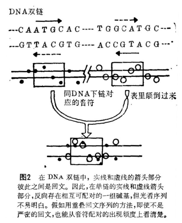 因此,将DNA转化成音符写在透明片上,在序列相似重复的场合,把欲比较序列的部分透明片像(图1)那样重叠起来。在回文序列的场合,把一方透明片倒过来重叠(图2),于是就会出现一目了然的图形。