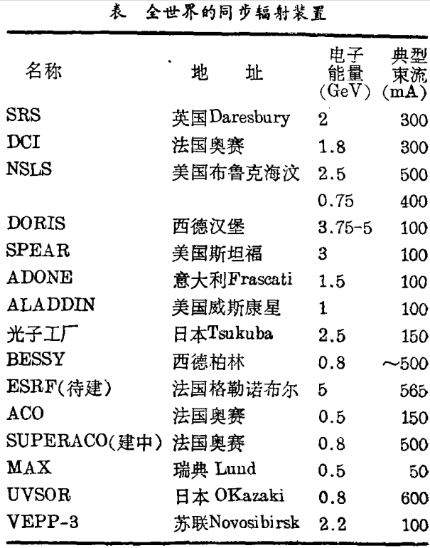 现在全世界已有几台加速器建成SRS,表中列出了其中部分,同时列出了拟建的新源。英国已在Daresbury实验室建成了。该贮存环的电子束为2 GeV,由—系列1.2忒斯拉磁铁组成。这些磁铁把电子束流弯曲成5 m的半径,从而发射出电磁辐射。另外还有称之为“摇摆器”(Wiggier)和波荡器(Undulator)的磁器件插在弯曲磁铁间,可以交替改变电子束的弯曲半径。因此、白连续区内的峰可以位移到更短或更长的波长。在此SRS上,一个超导5忒斯拉摇摆器磁铁产生波长0.1 ?的硬X射线。由0.3忒斯拉永久磁铁组成的波荡器发出10 ~ 100 ?范围的强辐射。
