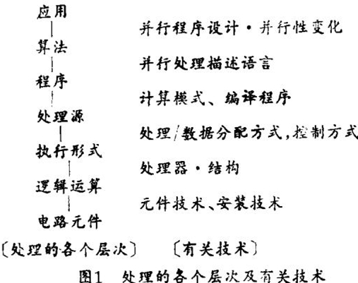 并行处理要求在某种应用于计算机上运行时,根据最初目的经过某些阶段的变换操作最终使各个电子元件都起作用。图1表示从这种变换操作的角度看到的各个处理层次。图中的右侧表示同各处理层次相互间变换有关的技术。在原有应用中内在的并行性,在经受图示的那些变形过程中将一点一点地失掉。因此,需要考虑所有这些技术,以便尽可能地提高综合性能。必须看到,只提高某一部分的效率,未必能提高整体的性能。