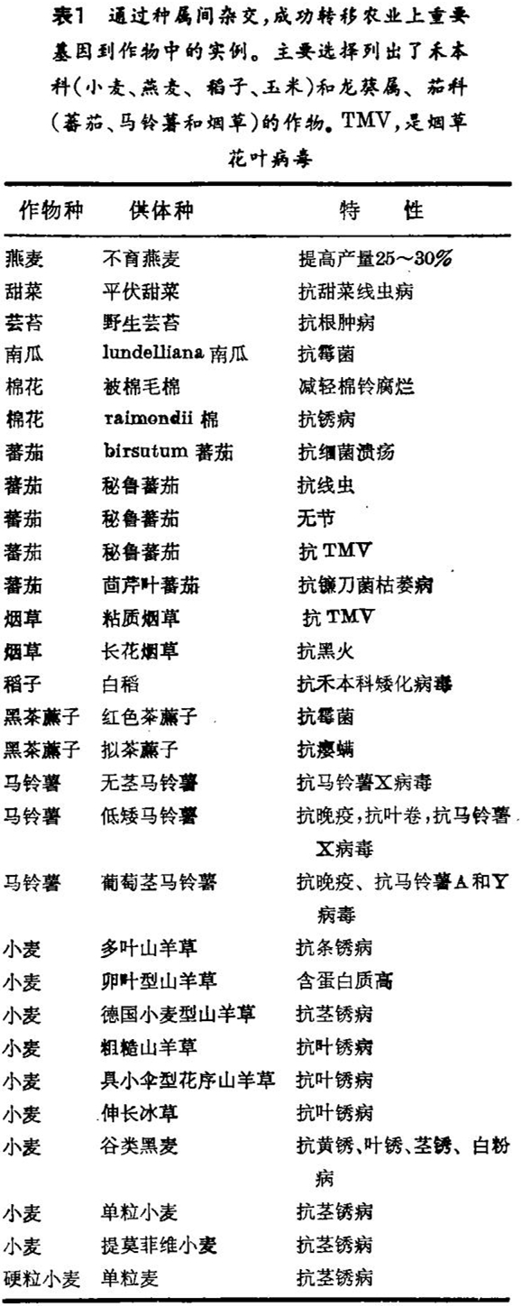 种间基因转移 进入二十世纪以来,植物育种人员不断在一定作物中,采用种间杂交技术,转化野生植物的基因到相近的栽培种内(表1)。本世纪内小麦育种的实践足可以说明这种进展情况。1930年,麦克凡登(McFadden)把4倍体双粒小麦的抗茎锈和抗黑粉病基因转化到了6倍体小麦中,得到的小麦变种,在美国广泛种植,保证了美国小麦栽培史上的最长的无锈病期。其他抗茎锈、白粉病以及抗小麦瘿蚊基因,也分别从提莫菲维小麦、单粒麦和肿胀小麦中转移进了各种小麦种内。