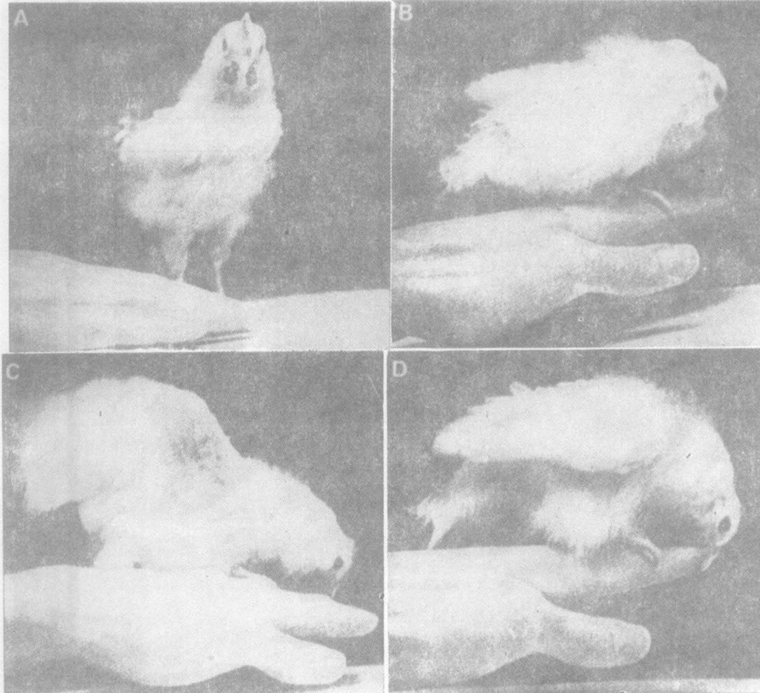 左半脑经注射的小鸡很快就显示出在视觉方面的差异:它们分辨不出混杂在砾石中的谷粒;而右半脑经注射的小鸡则无此差别。同时,左半脑经处理的这种辨识不出谷物的小鸡即使出生只有1—2周却似乎更喜欢争斗、交配,而右半脑经同样注射却无此种倾向。这种情况在雌雄小鸡中是相同的。