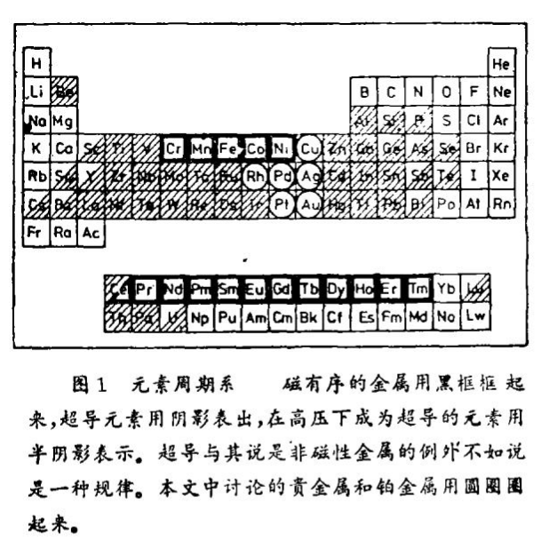 今天有许多超导元素以及超导的金属化合物和合金,然而,是否金和铂以及别的金属在进一步冷却下会变得完全超导这样一个问题还没有最终得到回答。如果用我们今天的知识来考察元素周期系,那么金属元素将被分成三族(图1):有转变到磁有序状态的金属元素;3d元素(即原子的外层电子的填充是在3d壳层上——译注)铬、锰、铁、钴与镍;以及稀土金属,从铈到铥。因此,有大量的超导金属元素。此外,有一些元素也可算作是超导的,它们在常压下是非导体,例如硅、砷或碲,然而在很高压力下它们就转变成金属导电的,继而在高压下冷却最后就转变成超导状态。超导绝不是一种例外,而常常是非磁性金属中的一种普遍规律。但是,还有一些金属元素,至今发现它们既不在磁性状态也不在超导状态。这首先是碱金属锂、钠、钾、铷和碱土金属镁、钙,其次是贵金属铜、银、金和铂金属铑、钯、铂。