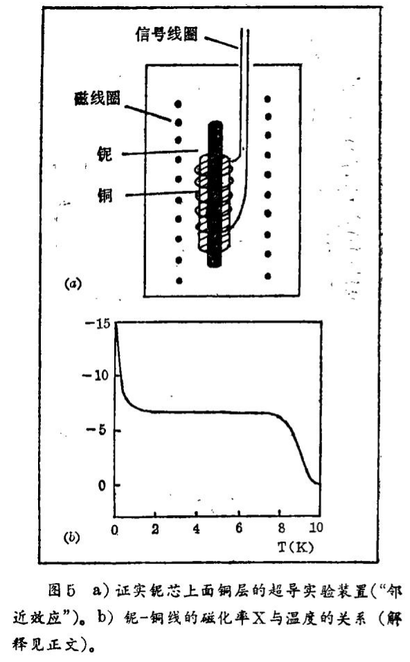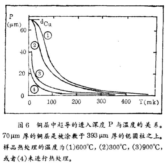 上面我已经讨论、用今天的低温技术和冶金学知识看来是不可能观察到铜中的超导。然而,有一种“技巧”使得正常导电的金属也能够从实验上来研究它的超导特性,为此,使一个正常导电的金属(例如铜)与一个超导体保持良好的电接触。于是,在两个金属接触处附近正常导体—薄层中感应了超导。长期以来,这个效应叫做“超导的邻近效应”。在开尔文范围内,这个超导层的厚度仅是很小的,大约为10-4 mm。然而在更低的温度,在其间感应超导层的厚度能极大地提高。在10 mK,在铜中的厚度大约是0.1 mm。这意味着,在毫开尔文范围内,我们能够研究一个适当的坚实的正常导体的超导特性。1978年奥达(Oda)和纳加诺(Nagano)已经首次证实了在mK范围超导层厚度的极大提高。1983年在拜罗伊特我们已经转向这样的研究。