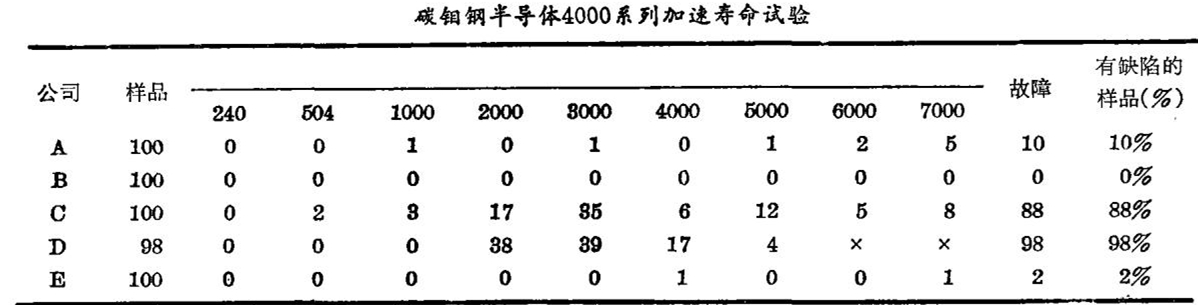 我首先把下列表拿出来给他们看,这是标准型集成电路(IC)的一种,那一个厂家都在生产的4000系列产品,从各公司取100个,并在严格条件下做加速寿命试验所得的数据。