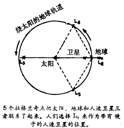 这个困难是可以克服的,减少3.5%的太阳辐射也是能够达到的,条件是镜子的光照区至少要达到4.5×106KM2,方法是在太阳和地球之间安置一颗人造卫星,以对地球永久地投射其阴影。因此,我便把注意力集中在这三体问题的一些特定解上,即所谓的拉格兰奇点上。