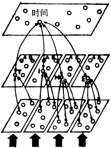 下面具体介绍一个字词知觉的并行分布处理的模型。从并行分布处理模型的基本假设出发,语言字词的知觉和理解包含多层次的同时的信息加工处理过程,而且各个层次之间的处理加工还存在大量的相互作用、相互激活或抑制。这些处理加工的层次可分为字母、字词的视觉特征、句法和语义等,而且在同一层次又有若干由联结模式所代表的可供选择的假设存在,相互竞争。下图显示了这种多层次、多单元的信息的并行分布处理的情景该图是一个字词知觉相互作用的激活模型的要图。图中分为三个层次,在最上面的层次是字词层次上对Time这个词的处理加工,中间的层次是对T、I、M、E四个字母层次的处理加工,最下面的层次接受输入刺激,是在字母视觉特征层次上的处理加工。其中每一长方形中的许多圆圈代表关于输入模式的互不相容的而又可供选择的假设。其中的双箭头联线代表各层次的认知单元之间的双向相互激活的联结。