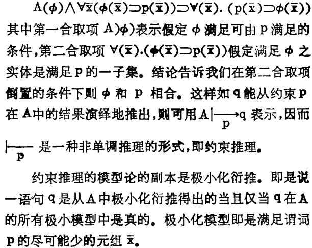 (2)麦卡锡的约束逻辑是他于1980年依据极小化模型提出的。1986年他对这种逻辑进行了扩充和推广,使之成为当前最完善的非单调逻辑系统。