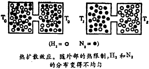 熵产生的作用是什么?它常常有双重的功用:它并非必然地导致无序或废物,它常常是产生有序的一种机制。这点可以从一些极简单的例子上看到,例如热扩散(图1)。考虑一个具有两个成分氢和氮的封闭系统。在均匀的温度下,氢和氮有均匀的分布。假如我们在这个系统上施加以热限制,引入一个温度梯度,那么,我们就将观察到一个浓度(或密度)梯度,在这里,熵产生有双重的效应:它是和产生无序的热流联结着的,但是,它也和“反扩散”联结着,这就意味着有序,因为它产生氢和氮的部分分离。这个双重效应在许多情况下都可以看见,在生物学中,脱氧核糖核酸(DNA)分子的产生是和别的分子的破坏相结合着的。在宇宙学中,我们遇到一个类似的情况,因为我们的宇宙似乎出现一种二象结构,相应于光子对重子的巨大的过剩(大约一个重子对109个光子)。光子显得是“废弃的产物”,而重子是“化石”,即非平衡物体。
