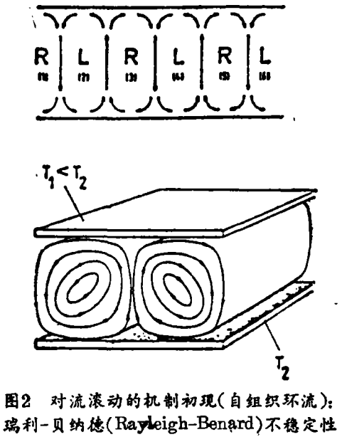 这可以用贝纳德(Benard)不稳定性的例子来说明(图2)。对两个水平板之间的液体层从下面施加以热流。在某种程度上,对于一个充足的温度梯度,相干运动就设立起来了。相干性是刚才提到的三个特点之一;它意味着数百万个分子互相“跟随”。的确,为重力和热流结合产生的这个非平衡稳定状态相应于相干性的机能初现。这是没有预期到的,因为对经典物理来说,有序是和平衡相联结着的(如晶体的情况),而无序是和不平衡联结着的(如湍流的情况)。