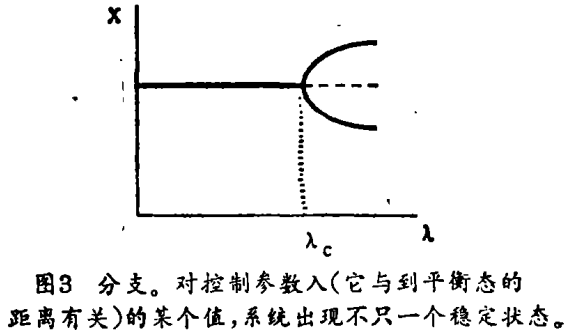我要强调的另一个方面是概率,当我们来到分支点时,这个方面是很清楚的。远离平衡态,系统进入非线性范围并且展示出对于描述它们演化的方程式的多重解答,在分支点,涨落的作用是决定性的,因为我们不能根据决定论的方程式来预言系统的行为将跟随哪一个分支(图3)。