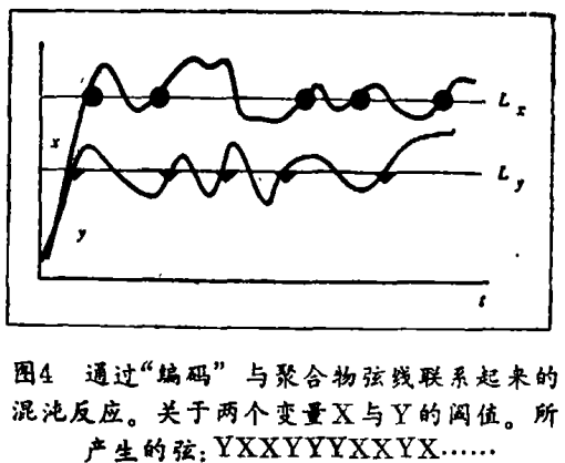 为了在一个很简单的例子中说明这点,我们取两个单分子体X与Y,它们能变换每一个到另一个,或者产生一个聚合物(图4)。每当其中一个呈现出高于某个临界水平的密集度时,这个单分子体就成为聚合物链的一部分,假如我们在近平衡条件下产生这个聚合物,按照泊桑定律,在这种条件下,密集度将剧烈起伏,那么我们将得到一个没有相关性的高度无序的链,如像XXYXYYYXYXYYXXXYX……假如系统的行为相应于一个极限环,那么,显然这个链将多少像XYXYXYXY……在这里我们已经看见非平衡已经纳入聚合物的结构。