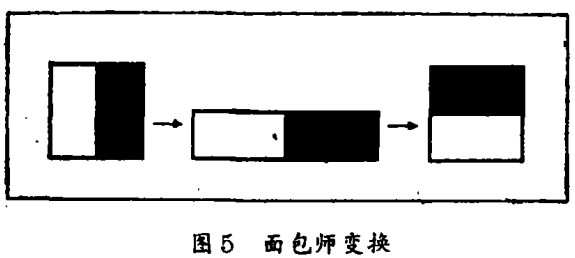 这点可以用“面包师变换”来很好说明,这种变换用于一个正方形,代表简单的操作顺序:拉平、切割、折迭。结果,任何两个初始点,无论它们靠近程度怎样,将由于这个变换的重复进行而或迟或早地分离开(图5)。对相空间中点的坐标使用二进制数字,这个散离可以给予一个很好的表示;于是每一次重复变换就相应于这些数字中间的一个“伯努利”移位。这就意味着,为了在我们的关于线性增加的时间间隔预言中确保一定的精确度,我们需要指数地增加初始条件的精确度。但是每一个有限的观察仅能给出一个有限数目的数字,无论这个数目是多少。这种情况是类似于气象学中的情况。预报长时间间隔的天气是不可能的,因为气候的演变似乎相应于很不稳定的动力学系统,其间任何两个初始条件,无论它们怎样接近,是随时间指数地发散的,这就是为什么我们仅能作出概率性预言的原因。