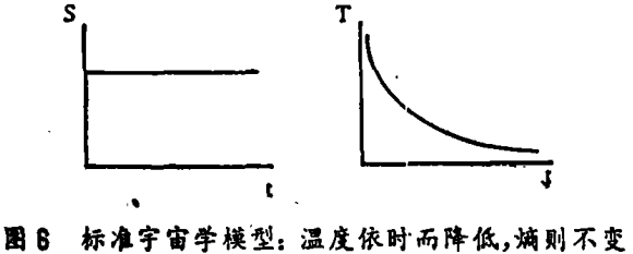 这样,科学界从静态宇宙走向历史的宇宙,相应于依赖时间的几何学,并最后地走向一个涉及固有演化的模型。在70年代建立起来的“标准模型”(图6)指出,当我们走向大爆炸的原点时,温度在增加。按照爱因斯坦的方程式,熵是一个常数,因为这些方程描述一个绝热的演化。这是自然的,因为广义相对论本来就是牛顿天体动力学的普遍化,在行星运动情况下,显然没有熵产生。这不是很满意的,过去几年已经做了越来越多的努力去了解初始条件。宇宙以巨大的熵和量级为1032的温度(即“普朗克温度”)开始的这样一个初始条件是一个奇怪的出发点,在某些方面已经取得成功的一种理论是“暴胀模型”,就不去多谈了,因为它没有谈及我们在这里感兴趣的不可逆性问题。